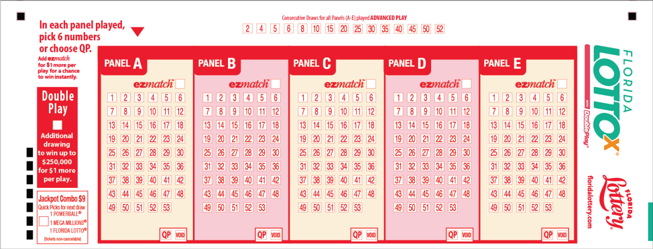 Players pick 6 numbers between 1-53 on each panel or just ask for a Quick Pick to Jet the terminal pick some or all of your numbers at random. Use the Florida Lottery app to create a digital play slip or fill one out at a Florida Lottery retailer. You can also purchase directly from a Florida Lottery vending machine.