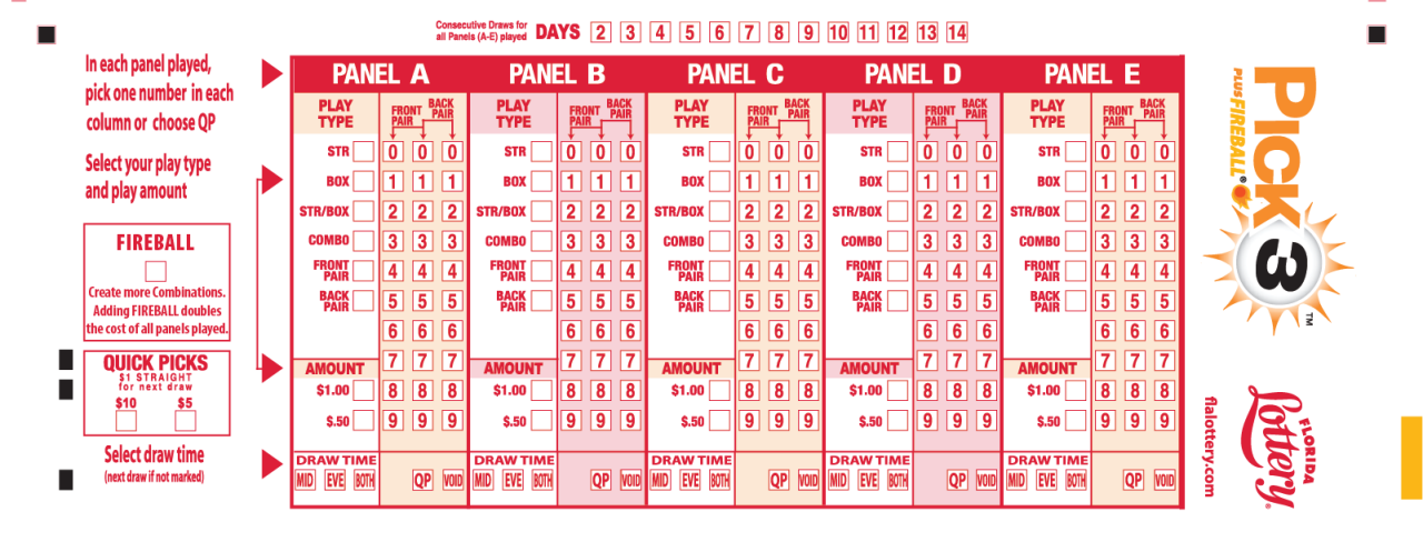 Visit any Florida Lottery retail location for a paper play slip to choose your numbers. Every PICK 3 play slip contains 5 panels. Tickets for each drawing may be purchased up to 11 minutes prior to the applicable drawing – 1:19 p.m., ET for the midday drawing and 9:34 p.m., ET for the evening drawing.