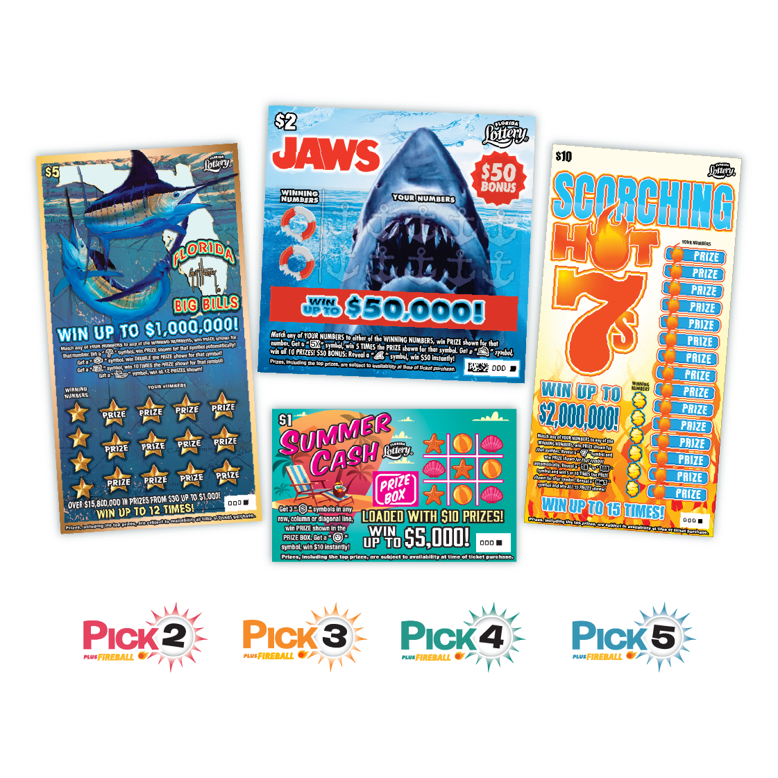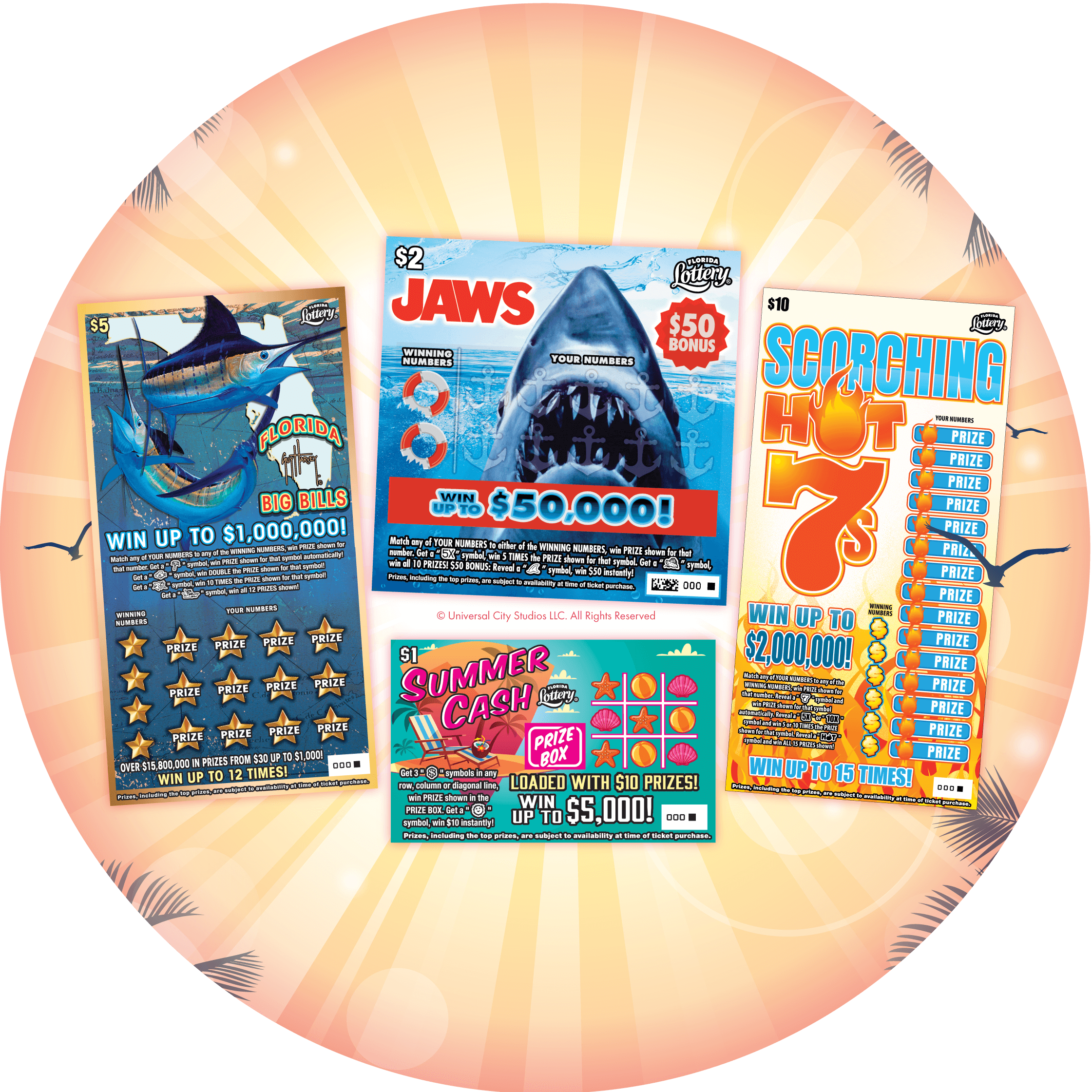 * Non-winning SUMMER CASH, GUY HARVEY® $1,000,000 FLORIDA BIG BILLS, JAWS and SCORCHING HOT 7S Scratch-Offs and $1 or more PICK game tickets purchased during the bonus play period are eligible.